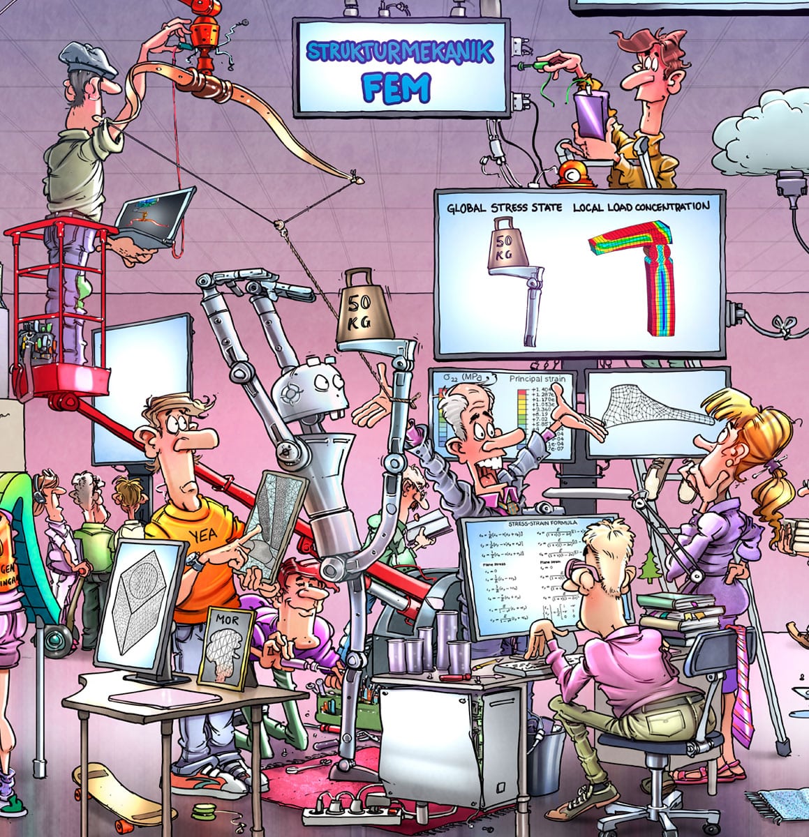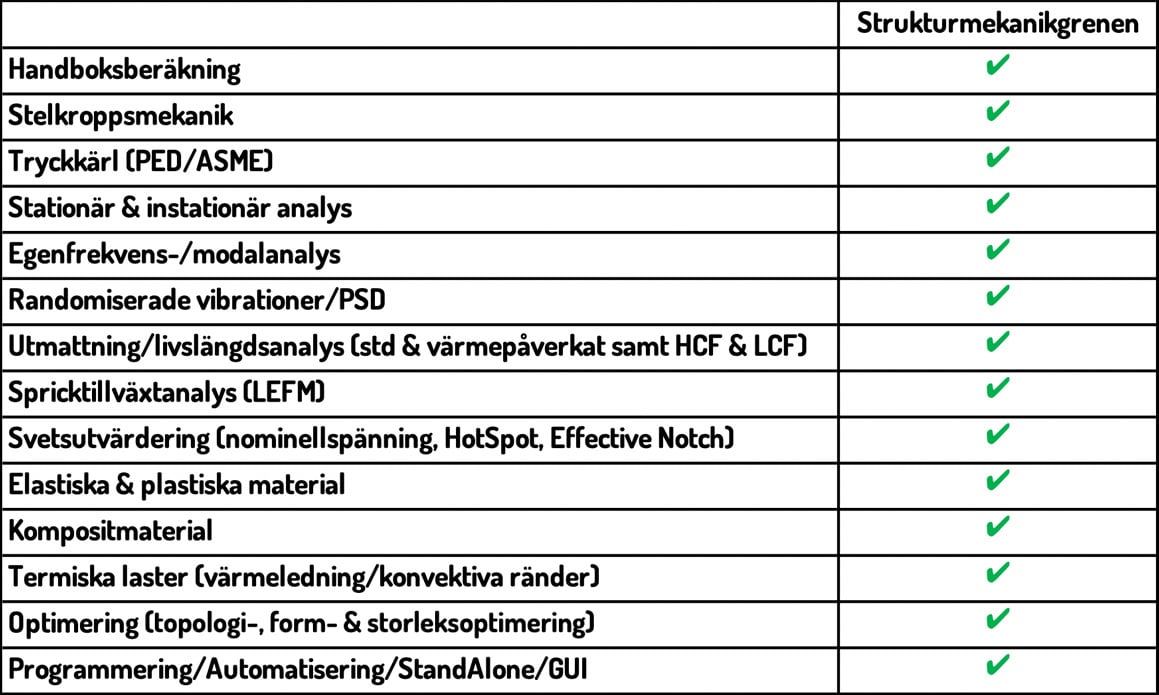 Vår kompetens är både bred och djup. Från klassisk svensk verkstadsindustri med gruv- och skogsfordon, processindustri och pappers-/massaapplikationer till modern höghastighetsproduktionsutrustning och avancerad inkapsling av satellitelektronik. Vi har jobbat med vindkraftsmontageutrustning och försvarsmateriel men även analyserat K-märkta skepps stödstrukturer och förflyttning av känsliga kyrkbyggnationer!